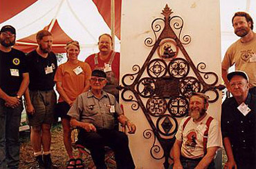 The Chapter Ring Grille was designed as a tribute to Francis Whitaker and was assembled by a team of six blacksmiths at the ABANA conference June 18th – 21st, 1998. The eight rings were selected from many submissions by the various ABANA chapters, and had to meet a standard set of rules governing their size and appearance. The finished work was purchased by Barbara and Tim Kris, of Franklin, NC, at the conference auction.